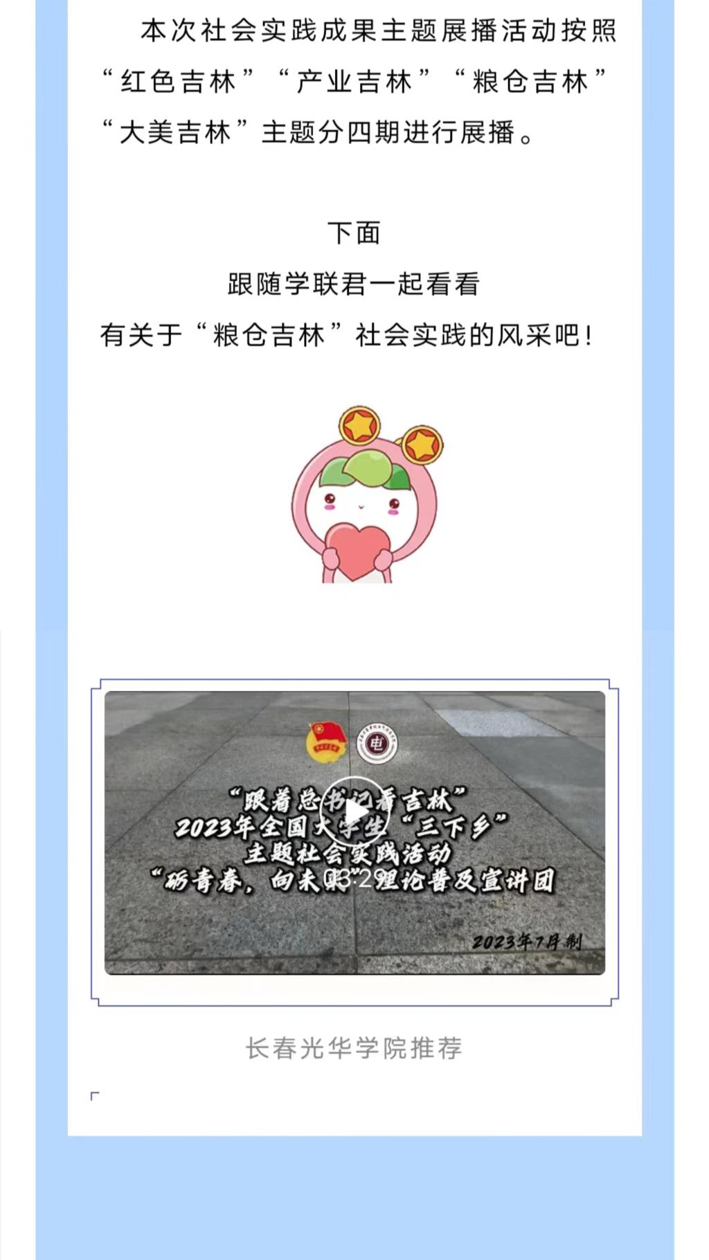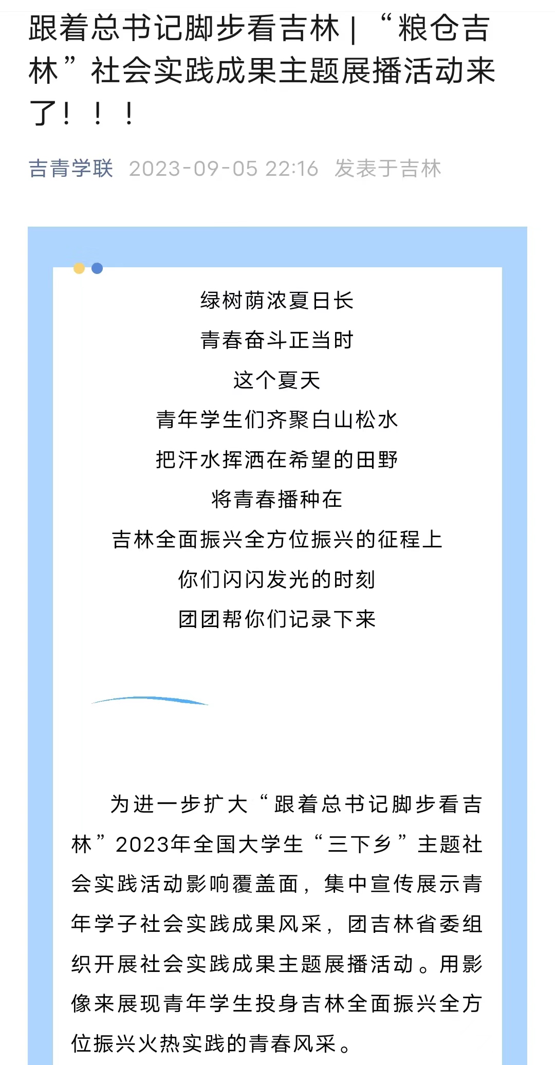 近日,吉青学联官微对“跟着总书记脚步看吉林”2023年全国老员工“三下乡”主题社会实践成果进行展播,其中展播出了unibet“砺青春,向未来”理论普及宣讲团暑期“三下乡”社会实践活动。