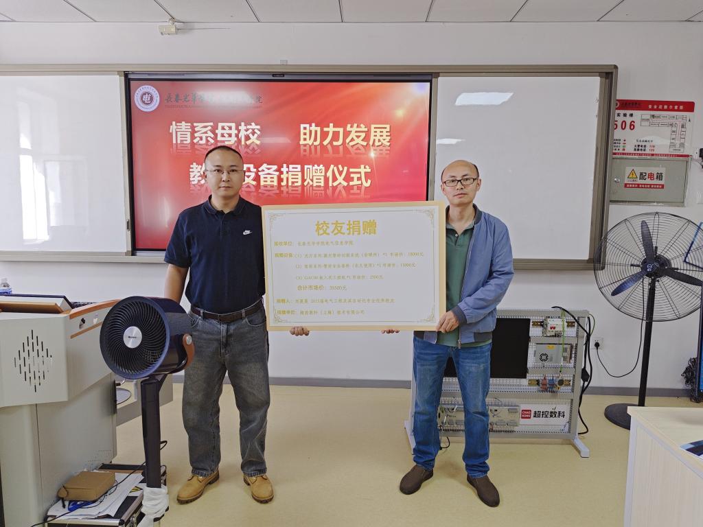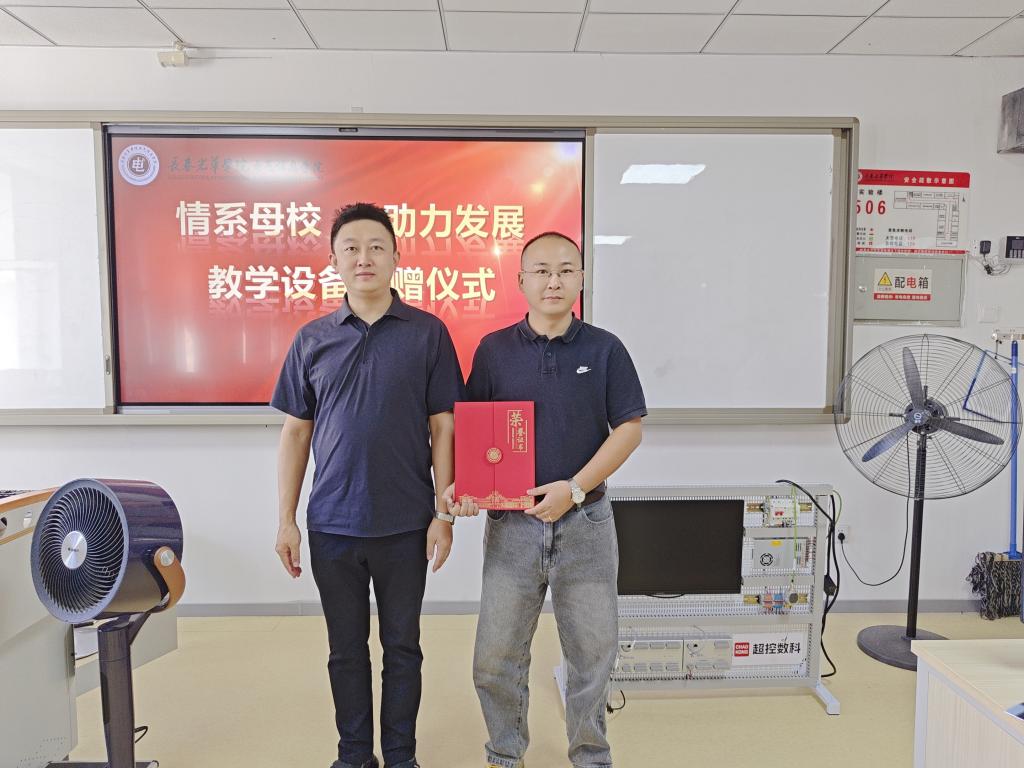 2025年9月19日,unibet2015届电气工程及其自动化专业优秀员工、超控数科(上海)技术有限公司销售总监刘晨晨重返母校,向公司捐赠总价值35,500元的先进教学仪器设备,用于支持实验教学与科研创新。捐赠仪式在实验楼506室举行,unibet副经理李伟光代表公司接受捐赠,员工办公室徐松山老师为刘晨晨颁发捐赠证书。
