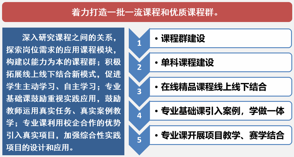 以教育部关于一流本科课程的实施意见为指导,分析新工科的发展指向,以培养应用型人才为宗旨,深度发挥课程积淀的特色和良好的基础,及时更新教学内容,完善教学方式和考核评价体系,深化课程思政要素,提高课程应用范围,努力建设多门具有示范引领作用的省级一流课程。