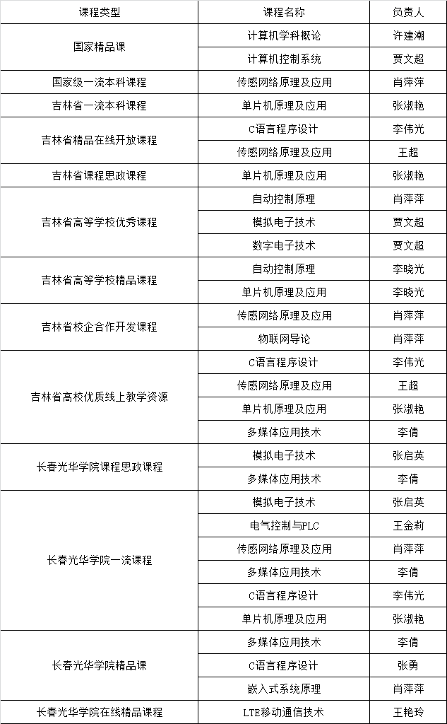 校企共建课程成效显著,现拥有“传感网原理及应用”国家级一流课程1门,“单片机原理及应用”吉林省一流本科课程1门、“C语言程序设计”省级精品在线开发课程2门、“单片机原理及应用”省级课程思政示范课程1门、“模拟电子技术”省级优秀课3门、“传感网原理及应用”省级校企合作开发课程2门。