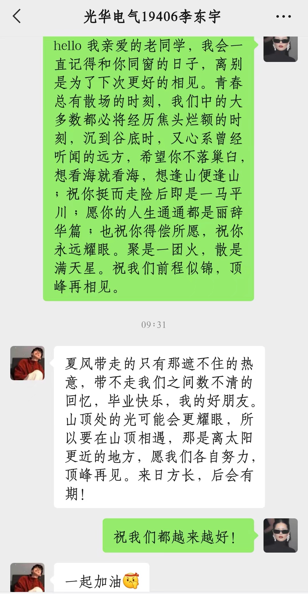 人生道路并非都是欢喜,失意低落在所难免,希望学弟学妹们勇敢且坚强,乐观且豁达。遇见你们是我们的缘,相识相知成美谈,友情的列车永远没有终点,祝愿你们的未来更加辉煌灿烂!