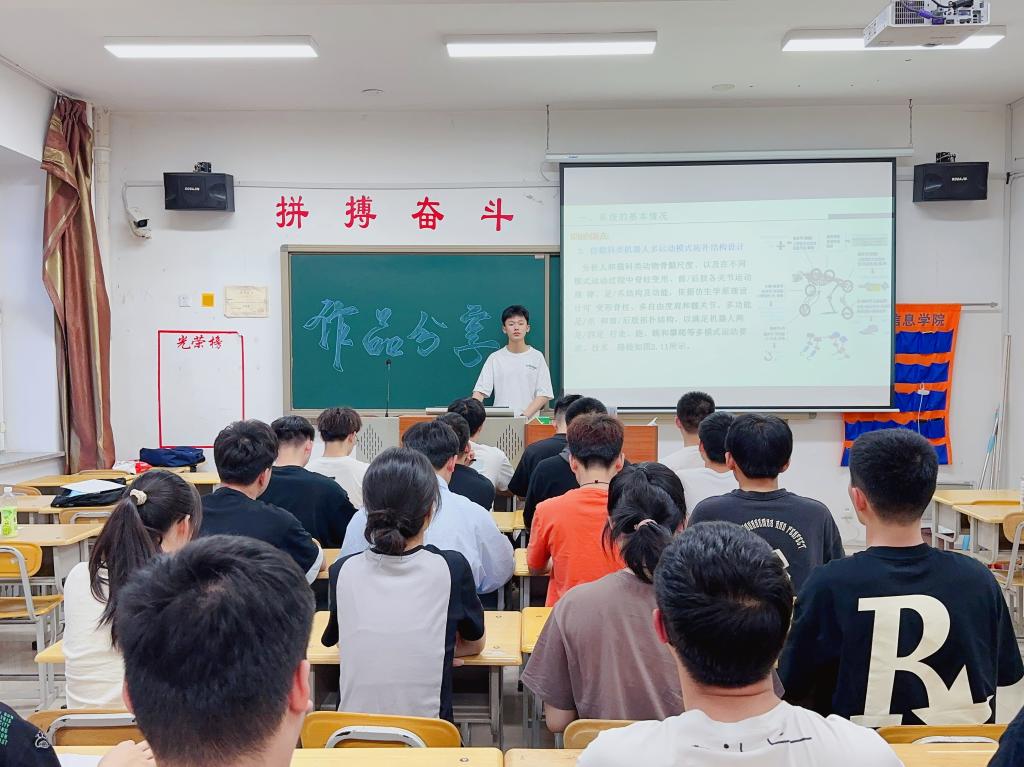 交流会上,张众同学首先为大家讲解了电子设计竞赛的基本流程和注意事项等内容,并为同学们介绍了“仿生类机器人控制系统”项目作品。接下来,张众同学针对系统的关键技术和在作品创作时遇到的技术问题进行了细致的讲解,同学们了解到了该系统是利用仿生学为原理,模仿动物代替人类完成在极端环境下的工作。最后,张众同学向大家展示了研发过程中从组装到测试过程的图片,使同学们对系统模式结构设计有更清晰地理解,进一步培养了同学们的创新意识与创造思维。