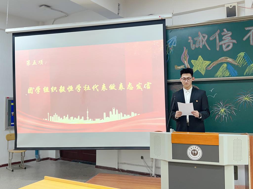 毅恒学社员工代表牛嘉博同学做表态发言,他表示,“诚信存折”活动不仅增强了同学们的集体荣誉感,而且也更加坚定了同学们立大志、明大德、成大才、担大任的决心。相信通过此次表彰大会,将树立起一面面鲜明的旗帜,激励同学们在未来的学习、工作和生活中,共同营造出一个勤勉好学、诚信待人、昂扬向上的新风气。