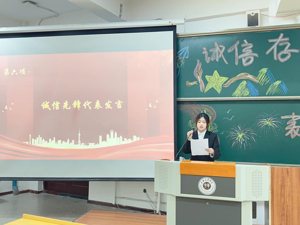 诚信先锋代表钟海荣同学发言,她表示,作为新青年员工,我们要肩负起时代赋予的崇高使命,要以钢铁般的意志守护诚信底线,争做诚信先锋,与时代同步伐、与祖国共命运、与人民齐奋斗。