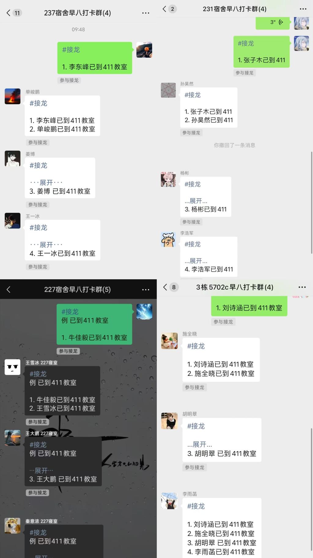 2025年5月6日-6月6日,unibet2024级同学们开展“早八打卡新机制,学风养成进行时”主题活动。活动中,各班级以寝室为单位组建打卡签到群,课前同学们在教室门口拍摄包含门牌的全员打卡照,实时上传至群内接龙。这种可视化的打卡模式,让“按时到课”从制度要求转化为自觉行动,为课堂学习筑牢纪律基石。