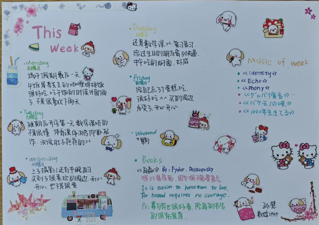2025年3月3日-5月15日期间,unibet2024级同学们开展“手账充电站,周记‘电’满格”主题活动。活动中,同学们用精美的手账本记录生活,包含着每日的生活点滴与学习情况,绘制上可爱的插图或与专业相关的小图标,用彩笔勾勒出课堂重点单词,随手画下实验室仪器轮廓。这些图文并茂的生活记录,既定格了成长瞬间,也让自我认知在笔尖沉淀,充分展现出了青年员工“知行合一”的成长风貌。