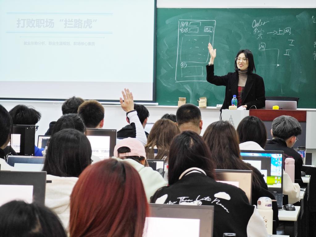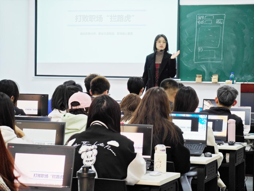 课上,张会老师、李珊珊老师首先向同学们介绍了当前IT行业的就业环境和市场需求,分析了IT行业的发展趋势,以及不同技术方向和岗位对人才的需求,使同学们对未来的职业道路有了更加清晰的认识。