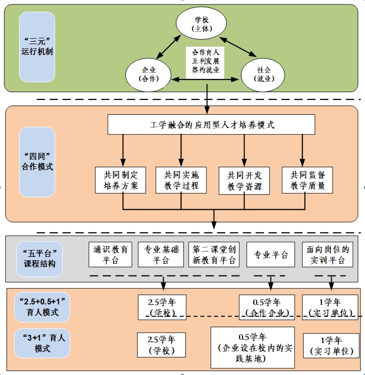 五平台:依托通识教育平台、专业基础平台、第二课堂创新教育平台、企业专业平台、面向岗位的实训平台设置的课程结构。
